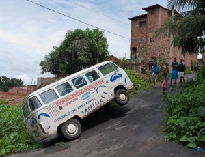 I was supposed to stay with a couchsurfer named Hamon. On my way to meet him it was POURING torrential rains and I was following Ecowapi’s directions when it led me up a steep hill in a favela. Well I got to the top of the hill to find that it was a dead end. So I started carefully backing Coco down the hill when WHAM!!! Everything on the dashboard comes flying at my face and I find myself looking out the winshield at the grey wet sky above. I had only been about 6 inches from the end of the asphalt which then dropped off steeply into a ditch. Well with the rains pouring down like they were the asphalt just gave way and this was the result:
