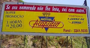 • Love Motels.  Yep…they are all over the place and very normal and socially accepted.  The fact is that many Brazilians live in the same house with several generations (kids often continue to live with their parents into their 30’s) so Love Motels are not thought of as sleazy (Although they do live up to Kitch standards with heart shaped jacuzzi tubs and mirrored walls and ceilings), but cater to couples who are just looking for a little privacy that they can’t find at home.  The best part about them is their names.  They make no qualms about what they are with names like Palácio do Prazer (Palace of Pleasure) and sometimes with Vegas like architectural themes (Mid-evil times, Egyptian, Parisian).