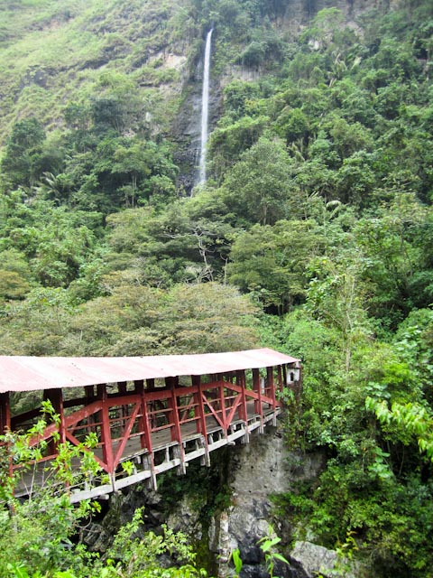So the next day, determined to dig into this canyon I had seen, I asked Clemencia if there was a trail that went that way and sure enough there was, El Sendero Alto de los Idolos. So I packed a lunch and headed out just as a light rain was begining to fall. I followed a very narrow foot trail that descended down into the canyon and brought me to a nice little covered bridge over the river.