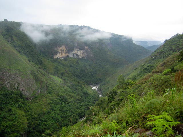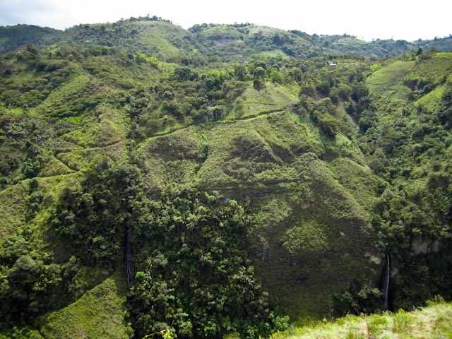 So Princess and I set off to find some old ruins in the surrounding hills. Not quite the Indiana Jones adventure that might come to mind when you think of searching for ancient ruins in Colombia but we had a swell time. Princess was a good animal. Her stubborness and refusal to follow direction suited her just fine. So we galloped and trotted along small country dirt roads in search of ruins. Again, the ruins were cool but got a little redundant, the real treasure was the scenery which was stunning. One of the stone monuments overlooked an amazing canyon that looked like a scene out of Jurasic Park with a river running down the middle, and steep cliffs on either side that looked as if they had sprung leaks right out of their sides with 60 foot wateralls (18m) that poured down feeding into the river. “I wonder if there is a way to hike down into that” I thought.
