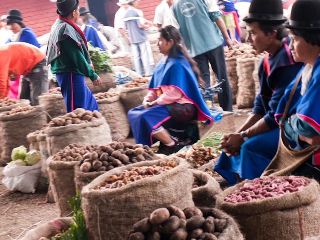 artesal goods made for tourists, but rather just bags and bags of potatoes and other produce. There must have been 30 varieties of potatoes for sale. The indian culture is still very much intact in the way they dress and I felt like I was back in the Ecuadorian Andes. The market seemed so authentic and real that I felt that walking around conspicuously snapping photos would have been way too intrusive so I spent a few hours wandering around with my small camera wrapped in a hankerchief taking hipshots so that none of my subjects knew they were being photographed. The end result was about 150 crooked and out of focus photos and about a dozen keepers.